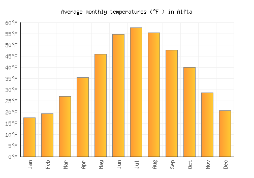 The bar chart below shows the average monthly peak daytime temperatures at Alfta