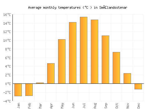 The bar chart below shows the average monthly peak daytime temperatures at Smålandsstenar
