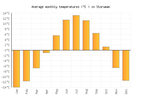 The bar chart below shows the average monthly peak daytime temperatures at Storuman