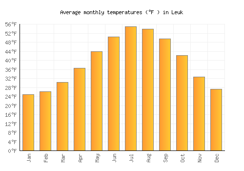 The bar chart below shows the average monthly peak daytime temperatures at Leuk