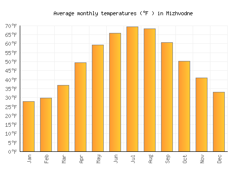 The bar chart below shows the average monthly peak daytime temperatures at Mizhvodne