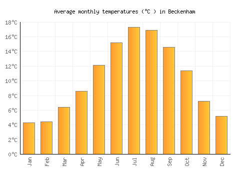 The bar chart below shows the average monthly peak daytime temperatures at Beckenham