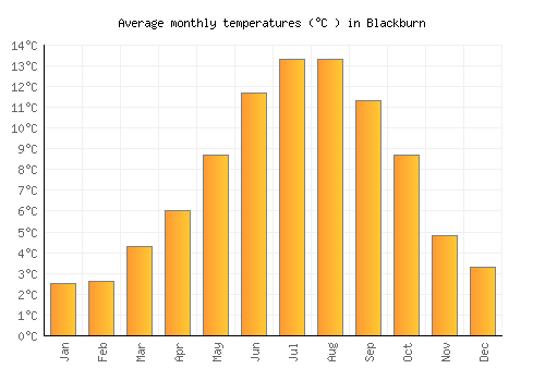 The bar chart below shows the average monthly peak daytime temperatures at Blackburn