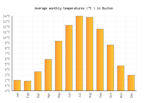 The bar chart below shows the average monthly peak daytime temperatures at Buxton