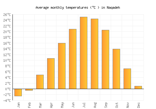 The bar chart below shows the average monthly peak daytime temperatures at Naqadeh