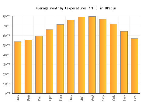 The bar chart below shows the average monthly peak daytime temperatures at Ofaqim