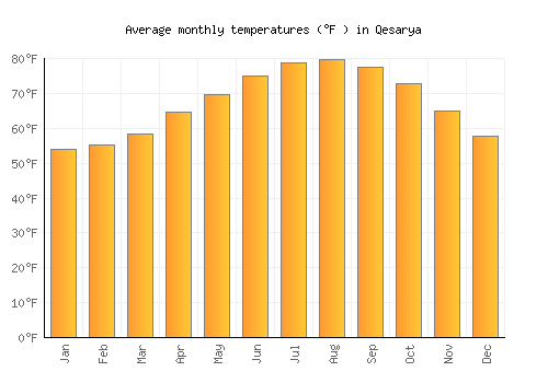 The bar chart below shows the average monthly peak daytime temperatures at Qesarya