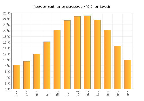 The bar chart below shows the average monthly peak daytime temperatures at Jarash