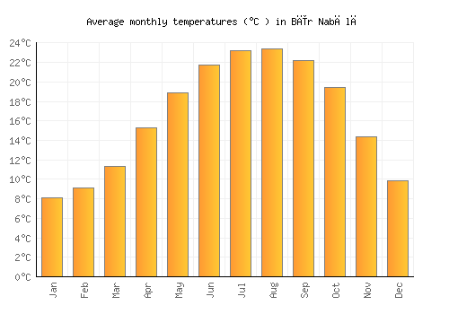 The bar chart below shows the average monthly peak daytime temperatures at Bīr Nabālā