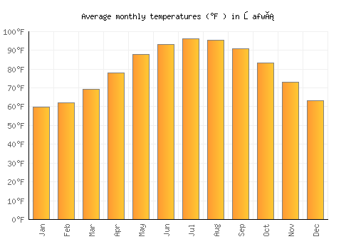 The bar chart below shows the average monthly peak daytime temperatures at Şafwá