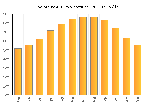 The bar chart below shows the average monthly peak daytime temperatures at Tabūk