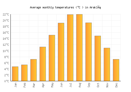 The bar chart below shows the average monthly peak daytime temperatures at Araklı