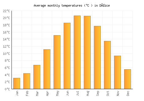 The bar chart below shows the average monthly peak daytime temperatures at Düzce