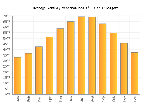The bar chart below shows the average monthly peak daytime temperatures at Mihalgazi