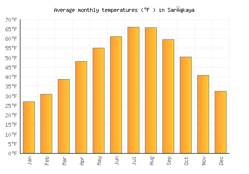 The bar chart below shows the average monthly peak daytime temperatures at Sarıkaya