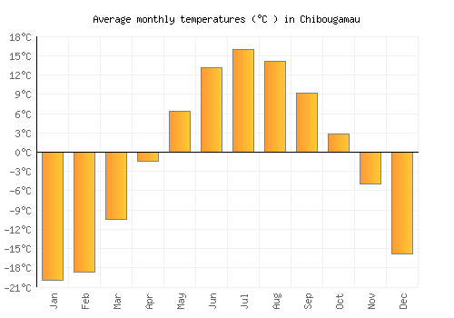 The bar chart below shows the average monthly peak daytime temperatures at Chibougamau