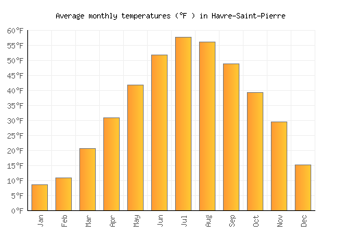 The bar chart below shows the average monthly peak daytime temperatures at Havre-Saint-Pierre