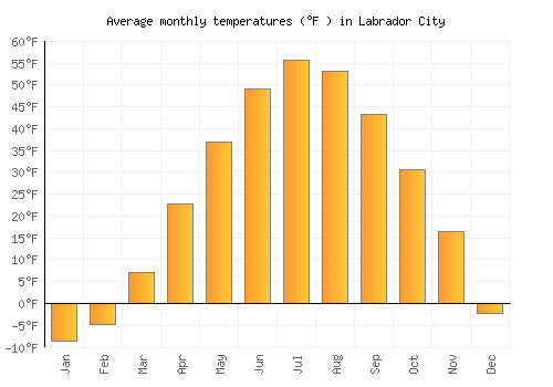 The bar chart below shows the average monthly peak daytime temperatures at Labrador City