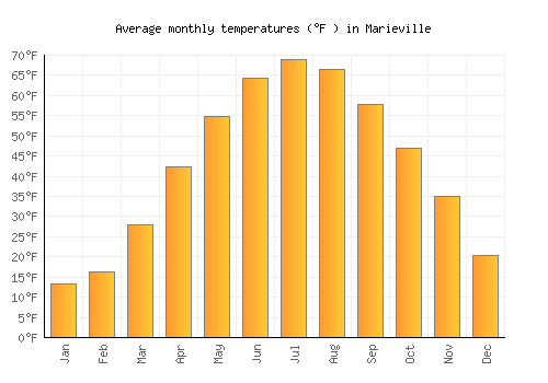 The bar chart below shows the average monthly peak daytime temperatures at Marieville