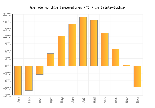 The bar chart below shows the average monthly peak daytime temperatures at Sainte-Sophie