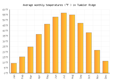 The bar chart below shows the average monthly peak daytime temperatures at Tumbler Ridge