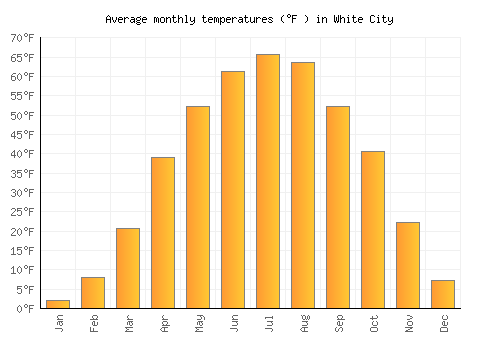 The bar chart below shows the average monthly peak daytime temperatures at White City