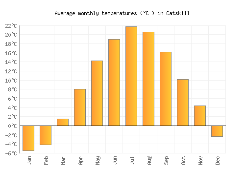 The bar chart below shows the average monthly peak daytime temperatures at Catskill