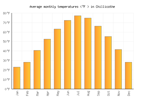 The bar chart below shows the average monthly peak daytime temperatures at Chillicothe