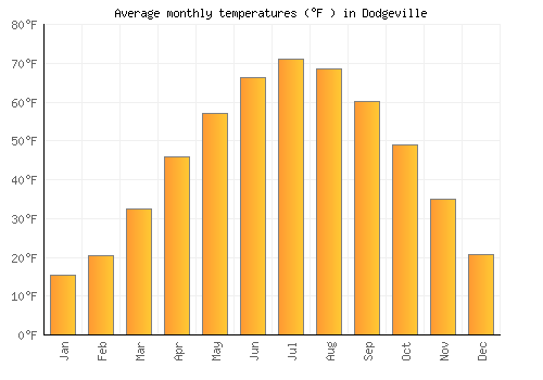 The bar chart below shows the average monthly peak daytime temperatures at Dodgeville
