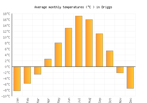 The bar chart below shows the average monthly peak daytime temperatures at Driggs