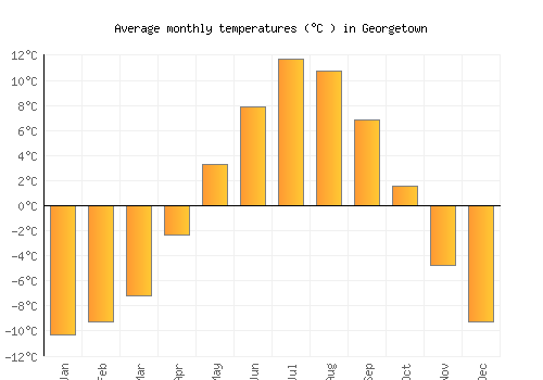 The bar chart below shows the average monthly peak daytime temperatures at Georgetown