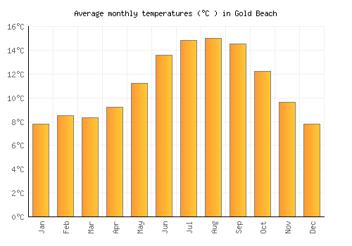 The bar chart below shows the average monthly peak daytime temperatures at Gold Beach