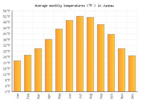 The bar chart below shows the average monthly peak daytime temperatures at Juneau