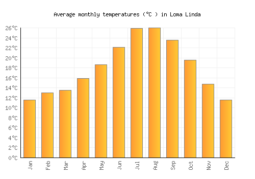 The bar chart below shows the average monthly peak daytime temperatures at Loma Linda