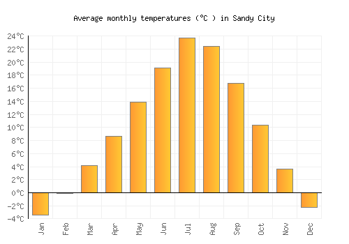 The bar chart below shows the average monthly peak daytime temperatures at Sandy City