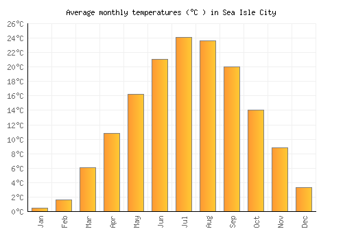 The bar chart below shows the average monthly peak daytime temperatures at Sea Isle City
