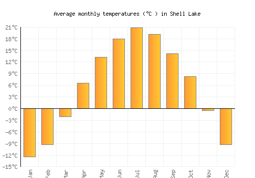 The bar chart below shows the average monthly peak daytime temperatures at Shell Lake