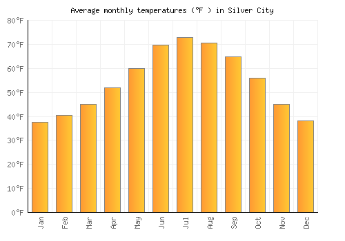 The bar chart below shows the average monthly peak daytime temperatures at Silver City