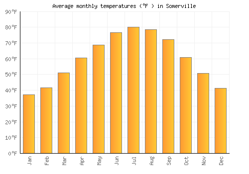 The bar chart below shows the average monthly peak daytime temperatures at Somerville