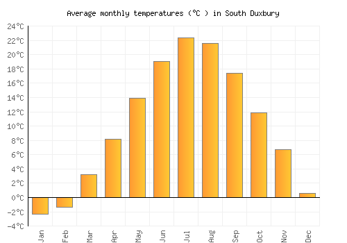 The bar chart below shows the average monthly peak daytime temperatures at South Duxbury