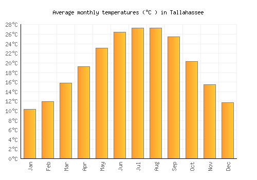 The bar chart below shows the average monthly peak daytime temperatures at Tallahassee