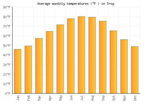 The bar chart below shows the average monthly peak daytime temperatures at Troy