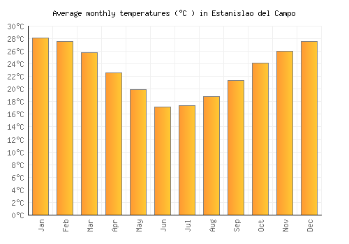 The bar chart below shows the average monthly peak daytime temperatures at Estanislao del Campo