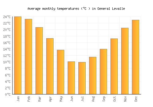 The bar chart below shows the average monthly peak daytime temperatures at General Levalle
