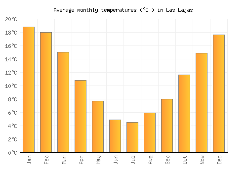 The bar chart below shows the average monthly peak daytime temperatures at Las Lajas