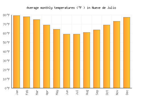 The bar chart below shows the average monthly peak daytime temperatures at Nueve de Julio