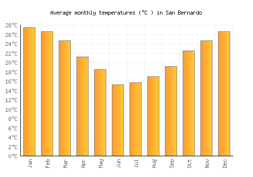 The bar chart below shows the average monthly peak daytime temperatures at San Bernardo