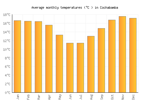 The bar chart below shows the average monthly peak daytime temperatures at Cochabamba