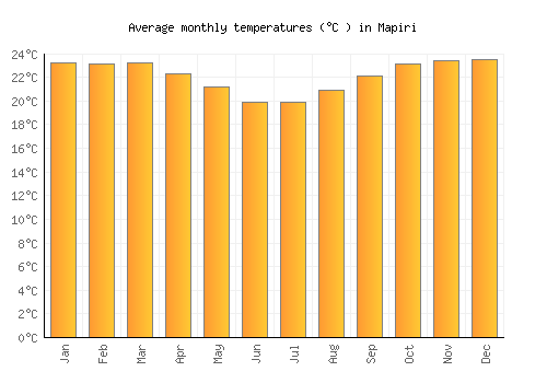 The bar chart below shows the average monthly peak daytime temperatures at Mapiri