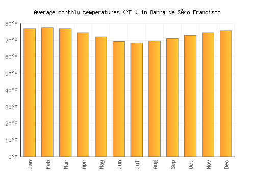 The bar chart below shows the average monthly peak daytime temperatures at Barra de São Francisco